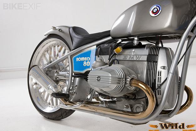 1350 Fontért vette az R80-as BMW-t, lemerevítette a vázat az első villát pedig egy H-D FXD villájára cserélte. Na igen, azoktól a csúnya berögződésektől nehéz szabadulni. A tank átalakult, hogy kevésbé emlékeztessen Quasimodo púpjára, majd Solley egyedileg készítette hozzá a hátsó sárvédőt, ülést, és az ülés alatti dobozt. A blokk kapott egy kis tuningot, valamint a gyári könyökök végére Supertrapp dobok kerültek.