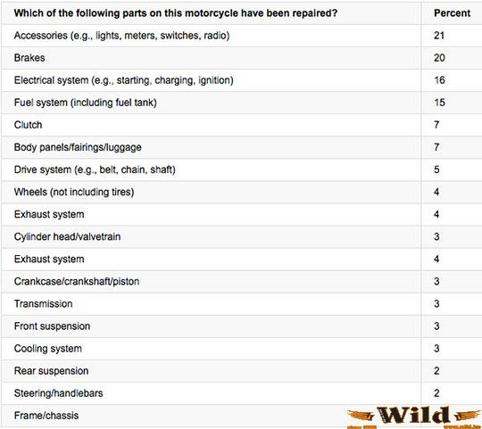 A Triumph és a Suzuki nem szerepel a felmérésben elegendő adat híján, de így is érdekes a kép. A japánok az első helyen végeztek (első a Yamaha, második a Kawasaki, majd a Honda). A tulajdonosok 10 %-a találkozott valamilyen műszaki problémával az első 4 év során. A Harley-Davidsonnál ez a szám 25%, míg a megbízhatóság szlogenjére építő BMW esetében a tulajdonosok 33 %-a jelentett meghibásodást. Ezek a hibák persze eltérőek lehetnek, a tanulmány szerint a blokkal, a váltóval vagy a futóművel nagyon ritkán akadt gond, és csak a problémák 25%-a vett ki 200 dollárnál többet a tulajdonosok zsebéből. A felmérésből persze nem derül ki, hogy ki mennyit használta a motorját, a BMW GS tulajdonosok valószínűleg többet mint az átlag, és minden bizonnyal igen rossz terepviszonyok között, ennek is betudható a rossz eredmény.