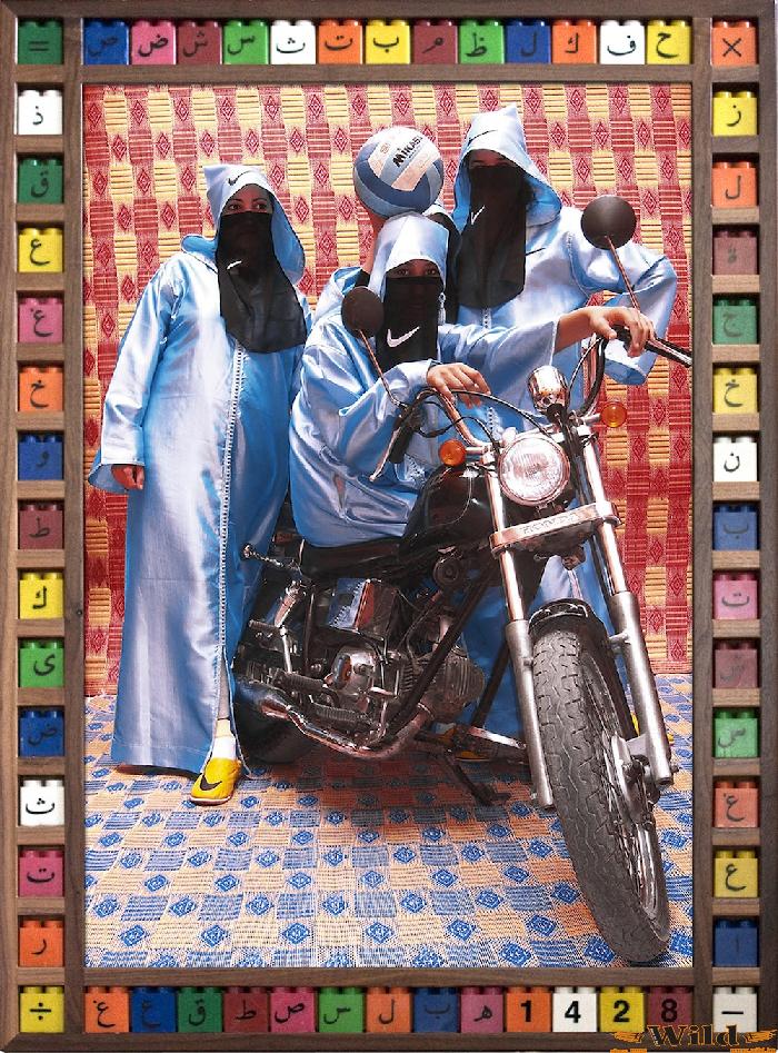 A marokkói születésű, de az Egyesült Királyságban élő Hassan Hajjaj fotóival azt a kettősséget mutatja be, ami jelenleg is uralkodik az Észak-afrikai országban. A talpig csadorba tekert nők a hagyományok ápolását szimbolizálják, de a motor és a minták (terepszínű, vagy Nike pipa) már a nyugati gondolkodásra utalnak.
