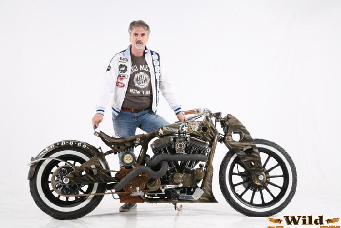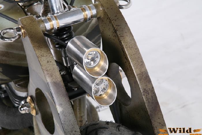 A műhely második igazán komoly építésével állunk szemben, de az első sem volt egyszerű, mert egy 600-as Shadow-ot alakítottak sietős-hasalós motorrá. Most egy gumiblokkos 883-as spori került flex alá, hogy az építők elgondolása alapján méltóképpen képviselhesse az amerikai hadsereg harcát a világbékéért. Első ránézésre a motor hátulja kissé furcsa szögben áll, nagyjából annyira, mint egy átlagos Ifa-fülke. Erről részben az tehet, hogy kicsit magasabban van, mint kellene, de ott van még egy másik probléma is, mégpedig a sárvédő. A KPM mindenképp különdíjra jelölné a hossza miatt, és kettő helyett 5 év műszakit kapna, de sajnos engem inkább arra emlékeztet, hogy mindenki csinál hülyeségeket az élete során … ezeknek többnyire az a közös tulajdonságuk, hogy a kijavításukhoz még nagyobb hülyeségeket kell csinálni (sárvédő tartó pálca). Ahogyan a repülőgépek orrára, úgy a tankra is felkerültek a kabalafigurák, jobb oldalt egy bulldog pipázik, baloldalon pedig egy ápolónő…nos ő nem pipázik.