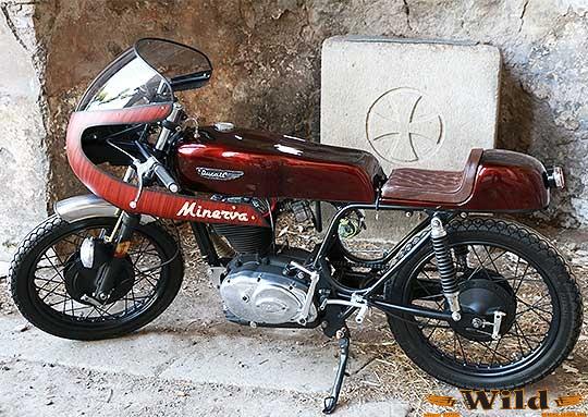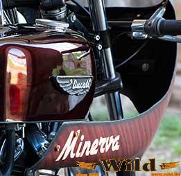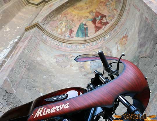 Simone Ceccarelli neve lehet, hogy nem mond sokat, de ha az Abnormal Cycles oldalkocsis flathed-jét említeném, talán a legtöbben már képben vannak. Nos, emberünk jelentős részt vállalt ennek építésében. A kis Ducati pedig nem véletlenül kapta a Minerva nevet: Ceccarelli ezzel tiszteleg a legendás olasz kézművesség előtt, aminek máig nincs párja. Ilyen például a platánfából kézimunkával készült furnérborítású fejidom, amibe Davide Aresi az egyedi bútorokat készítő művész eltérő színű fából berakással helyezte el a logót és a feliratot.