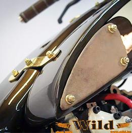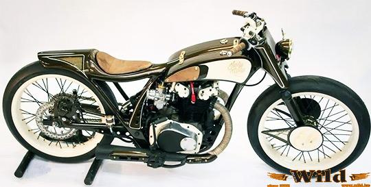 Board trackert akart, de olyat, amit a japánok készíthettek volna a ’20-as években. Ehhez hozzárakott egy fél kávéskanálnyi café racert, és egy kis art deco-t is, szigorúan patikamérlegen adagolva a stílust. A vázból csak a blokktartók és a nyak maradt meg, Mike az összes többit saját maga készítette. A lengővillát 5 cm-el toldotta meg, majd központi rugóstagot kapott a Honda. Osztott tank gondoskodik a ’20-as évek versenyszellemének felidézéséről, az elektronika és akkumulátor pedig a faridomba került. Az ülés könnyen és ötletesen távolítható el…mágnes tartja a helyén. A motor színvilága igen harmonikusra sikerült, tekintve hogy Mike színvak. Ha pedig azt mondom, hogy főállásban fényezőként dolgozik, azt úgysem hiszitek el.