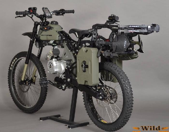 A koncepció a gyökerekhez nyúlik vissza, amikor még nem vált szét egyértelműen a motor és a kerékpár. Ránézésre egy durva downhill bicikli vázra épített gép, pedig itt minden a Motoped saját terméke. Önindító és berúgókar segítségével is életre kelthetjük az 50 köbcentis négyütemű erőforrást, ami 2,5 lóerőt teljesít. A fogyasztás minimális, a két kiegészítő üzemanyagtartállyal együtt 700 km-es hatótávolság is elérhető. A 2500 dolláros árért cserébe nagyon komoly technikát kapunk: króm-molibdén váz, hőkezelt alumínium lengővilla, állítható lengéscsillapítók 20 cm-es rugóúttal, és Hayes Prime 4 dugós hidraulikus fékek vannak a dobozban. Igen a dobozban, mert a motort saját magadnak kell összeszerelni, amit nem érdemes halogatni, mert ha a zombik már az ajtót kaparják és te még az összerakási útmutatót böngészed akkor elkéstél, és Brad Pitt sem fog megmenteni.