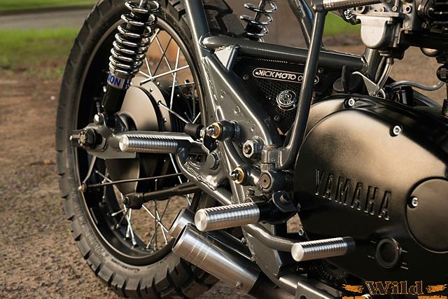 Mivel sose végeznek félmunkát, a KickMotos srácok addig bontották a Yamahát, amíg egy teljesen tiszta külsőt nem kaptak, hiszen egy üres vászonra lehet csak mesterművet alkotni. Ahelyett, hogy sima feketére festették volna a vázat, inkább egy középszürke árnyalatot kapott, amivel nem csak egy letisztul látványt értek el, hanem azt is, hogy nem olvad bele a háttérbe.