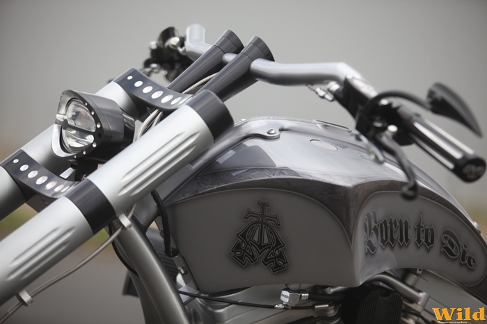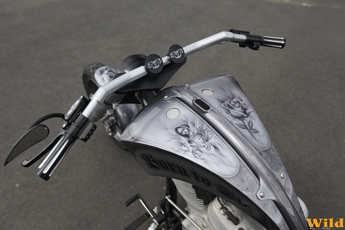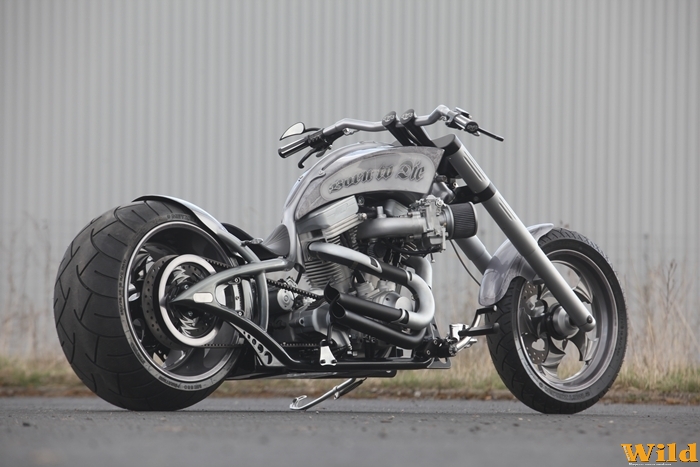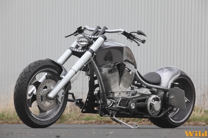 A váz Kodlin saját terméke, egy Q-Modo merevváz, de 300-as gumihoz szélesítve. Ebbe került bele egy TP 124 köbinches blokk a maga 130 lóerejével. Jobb érzésű emberek legfeljebb egy 45-ös Mikunit mernek felrakni egy ilyen blokkra, de itt egyből kettőt sikerült felpattintani a szívócsonk végére (vajon náluk is 400 Ft a benzin?) 6 gangos Baker váltó viszi át az erőt a 280-as hátsó kerékhez, ami egyébként - akárcsak az első - Jesse James terméke.