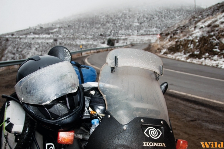Ahogy haladtam a hegyekben, a szél csak erősödött, hordta a havat is, és csak reméltem, hogy nem lesz lefagyás, mert egyenesben is erősen be voltam dőlve, oly nagyon fújt. A legmagasabb hágóra 2664 métert írtak, s gyönyörű havas hegyek közt vitt. Nagy megkönnyebbülés volt fél órán belül végre 1600 m alá süllyedni. Havat már nem fújt a szél, de így is majd’ megfagytam a motoron. Egy utolsót még kellett tankolnom a drága török benzinből, mert már így is rezgett a léc, 420 km-nél többet mentem egy tankkal (23 liter), s az iráni határ még arrébb volt. A határhoz közeledve sokkal enyhébb lett az időjárás.