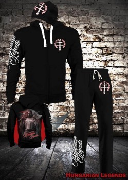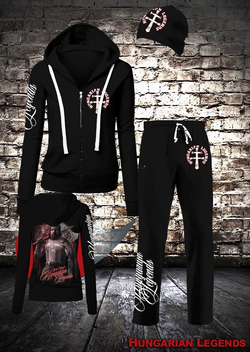 Kapucnis, cipzáras pulóver, hosszú melegítőnadrág, sapka.